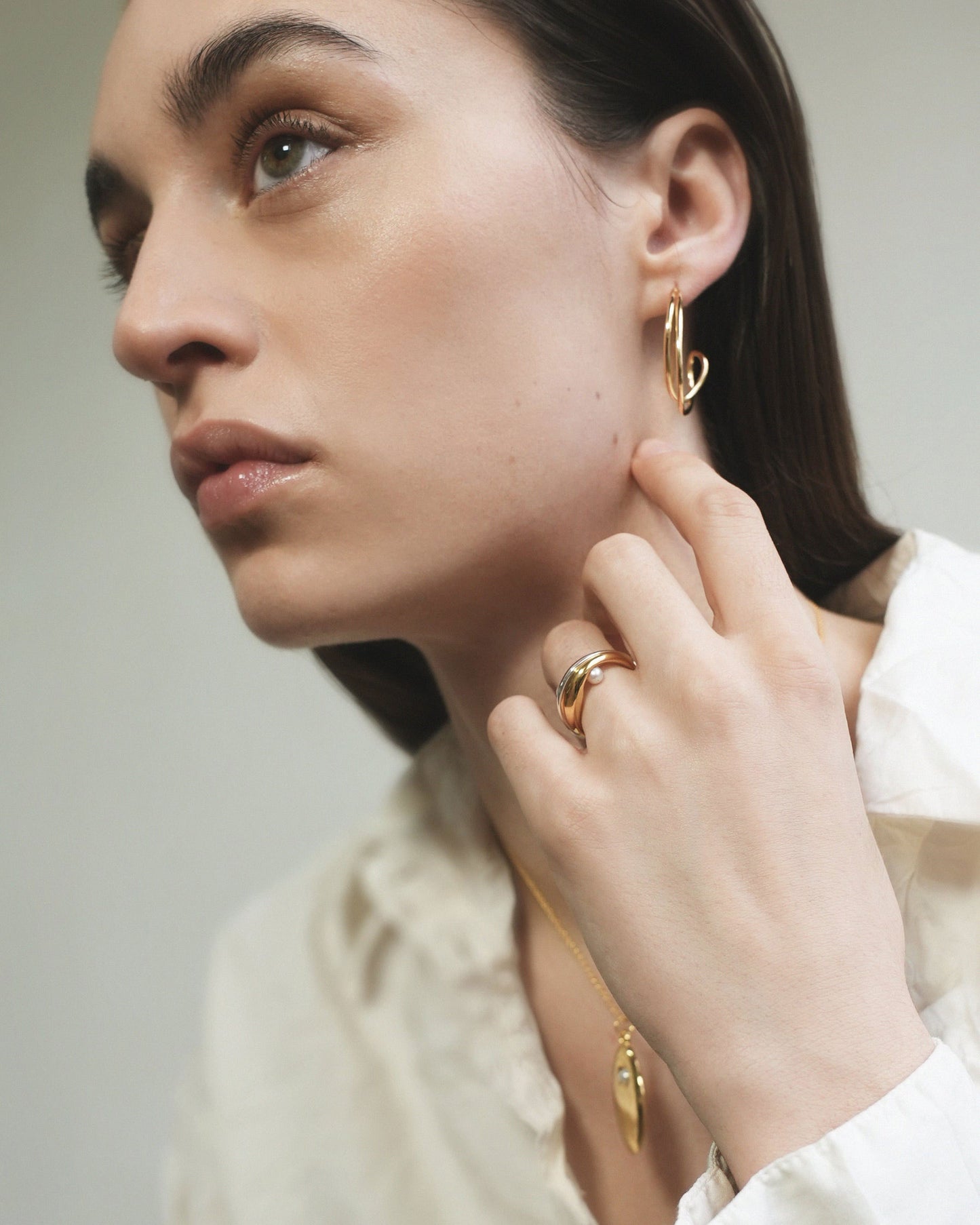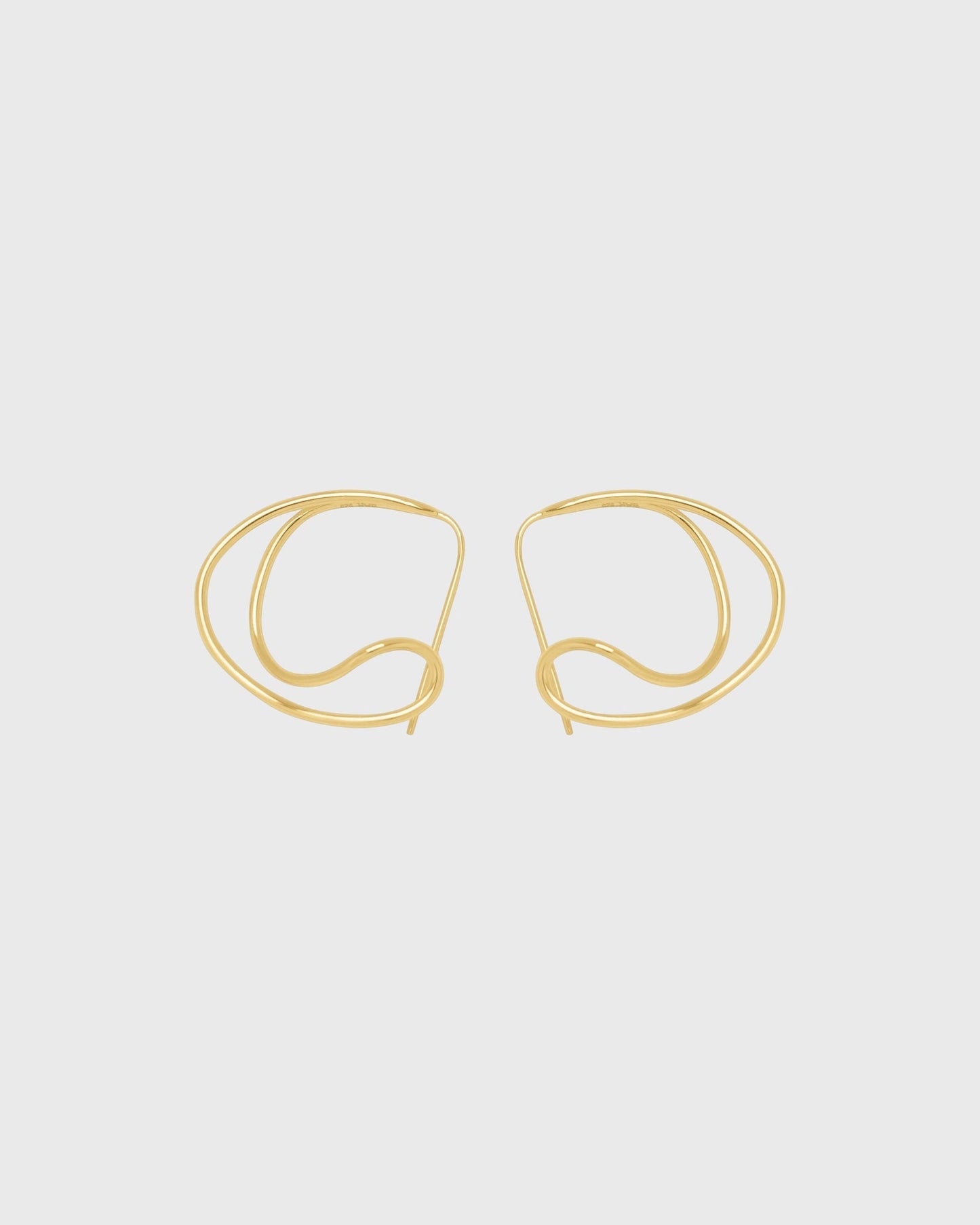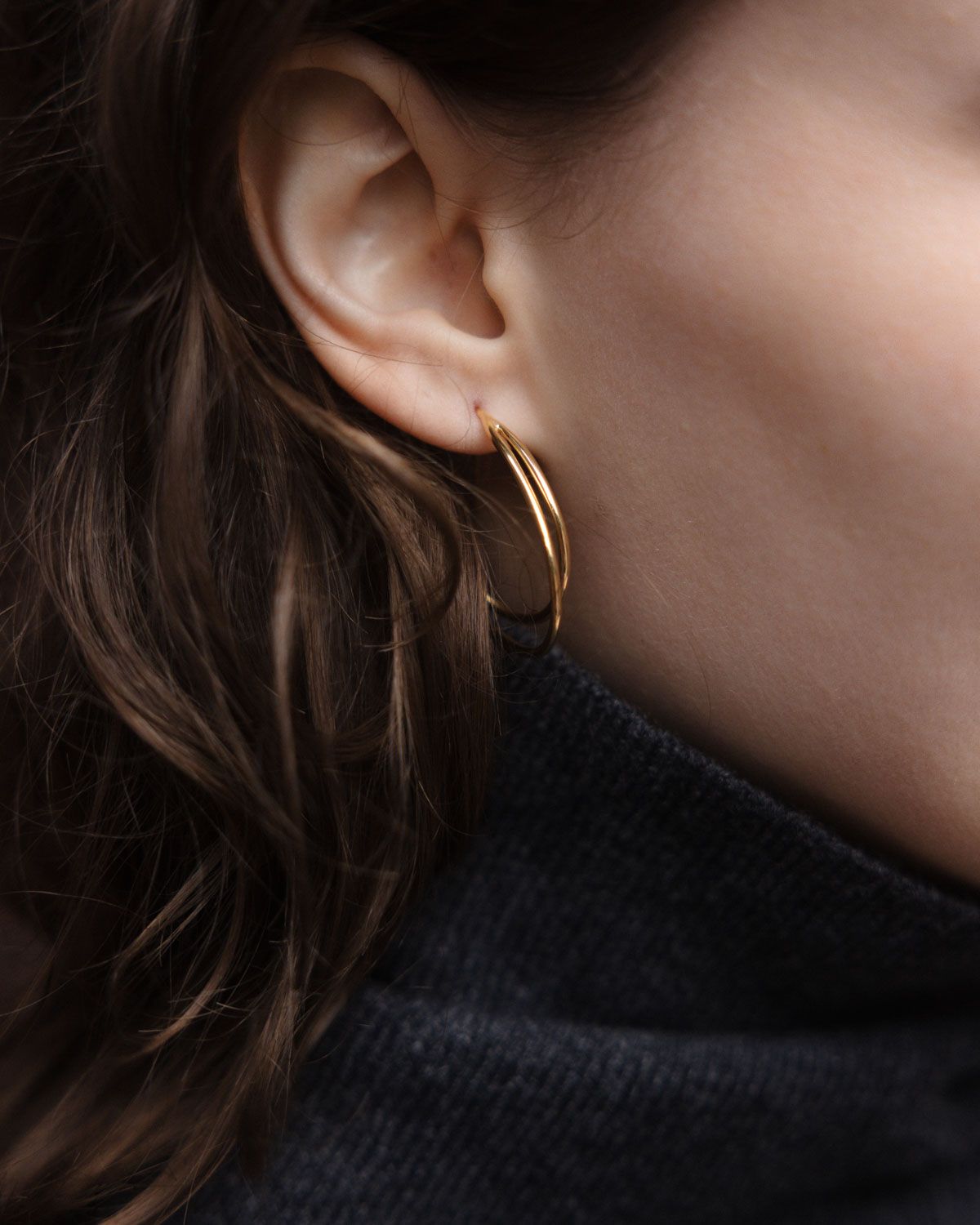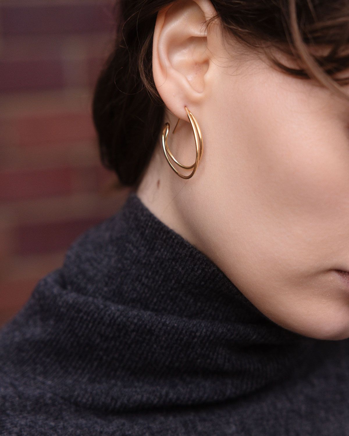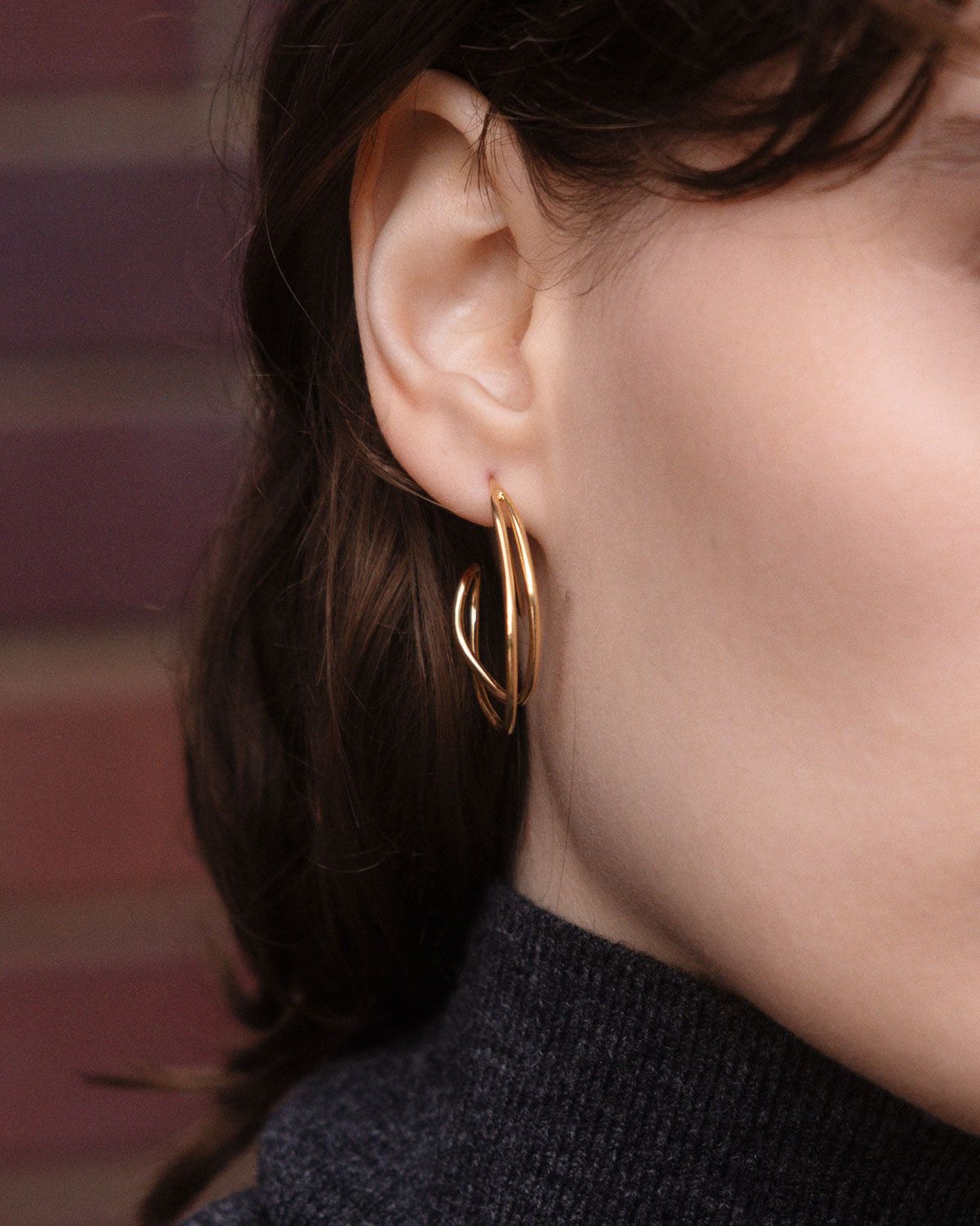 CROSSED PATHS EARRINGS は、ユニークなダブルフープデザインが魅力。