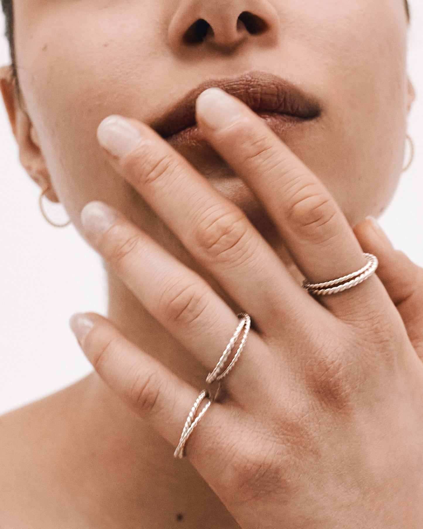 ツイステッドダブルリングは、異なる太さの2本のリングが重なり合い、手作業でねじられたテクスチャーがビクトリアンジュエリーの面影を漂わせるデザイン。クラシックなフォルムにモダンなニュアンスを添え、複数のリングを重ね着けしたようなスタイルが指先に個性をもたらします。