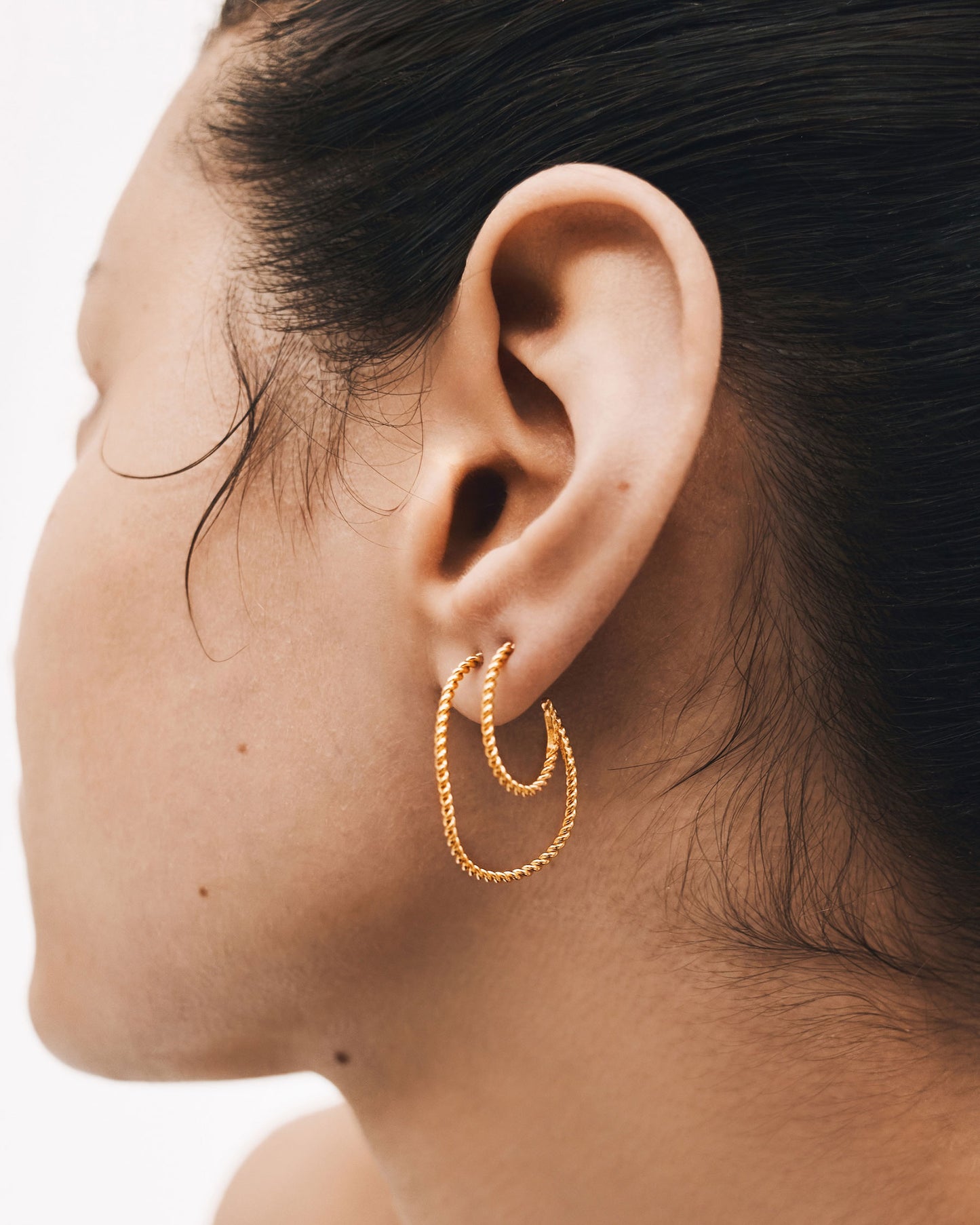 ツイステッド・エロンゲイテッド・フープピアスは、2本のワイヤーをねじり合わせることで、自然の曲線や航海用ロープを思わせるテクスチャを作り出しています。シンプルなバタフライキャッチで仕上げられたタイムレスなピアスは、とても軽やかなつけ心地で、日常に欠かせないアイテムです。