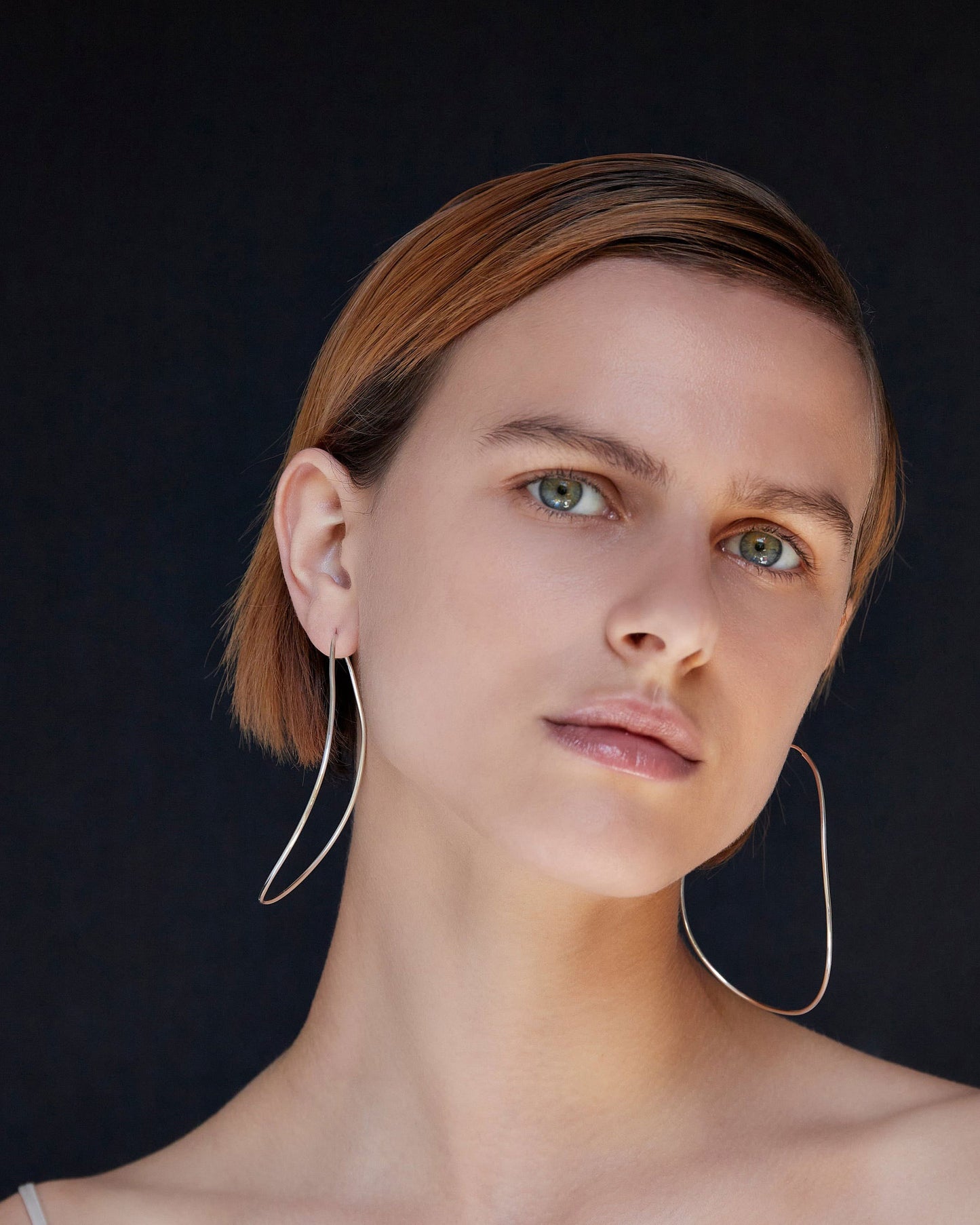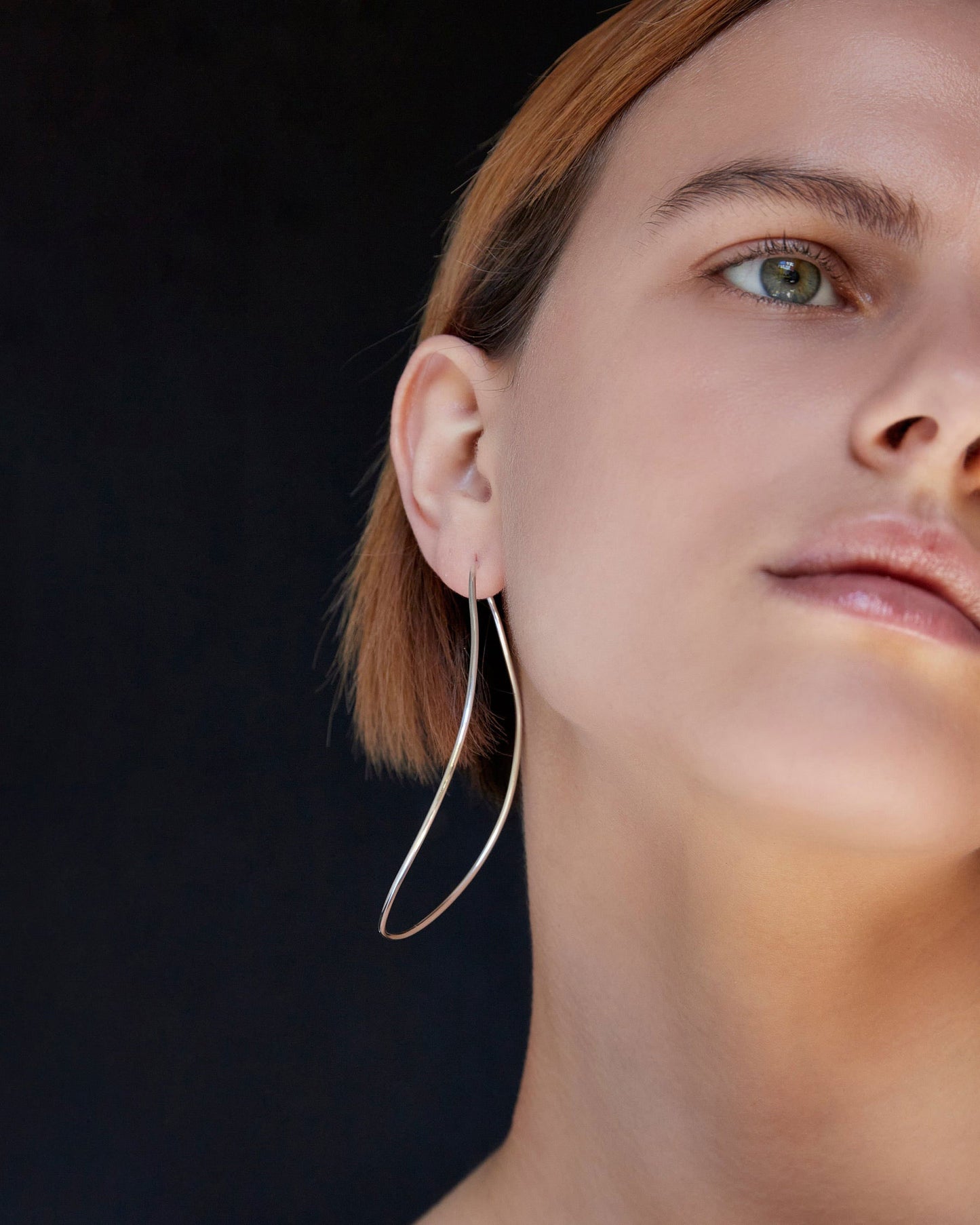 この大きくて繊細なフープは単体でも存在感がありますが、同シリーズのCHUNKY OUT LINE EARRINGS や COUNTOUR EARRINGSとの重ね付けもおすすめです。