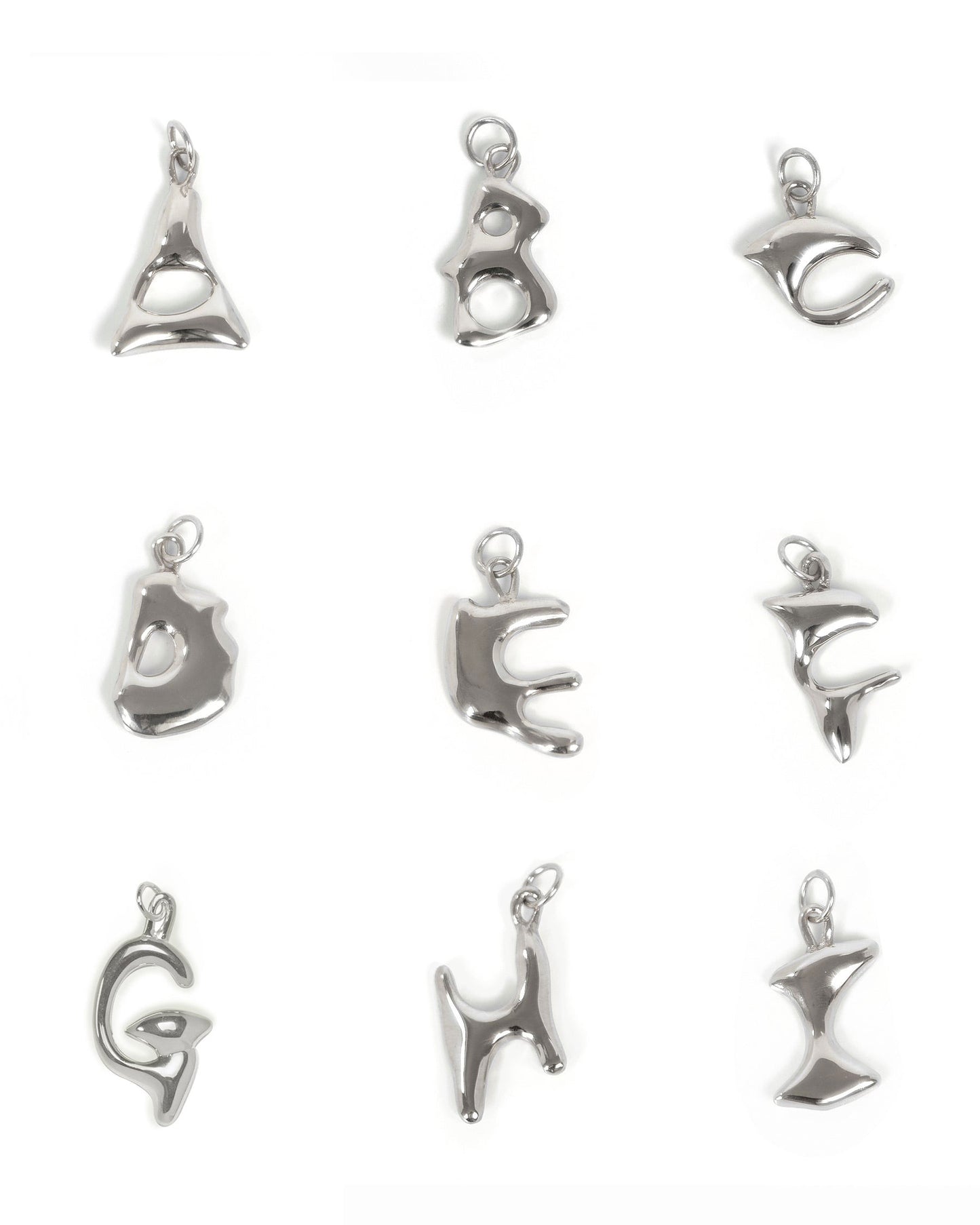 ALPHABET CHARM は、溶かしたワックスで一文字ずつ手描きするように形づくられたデザイン。