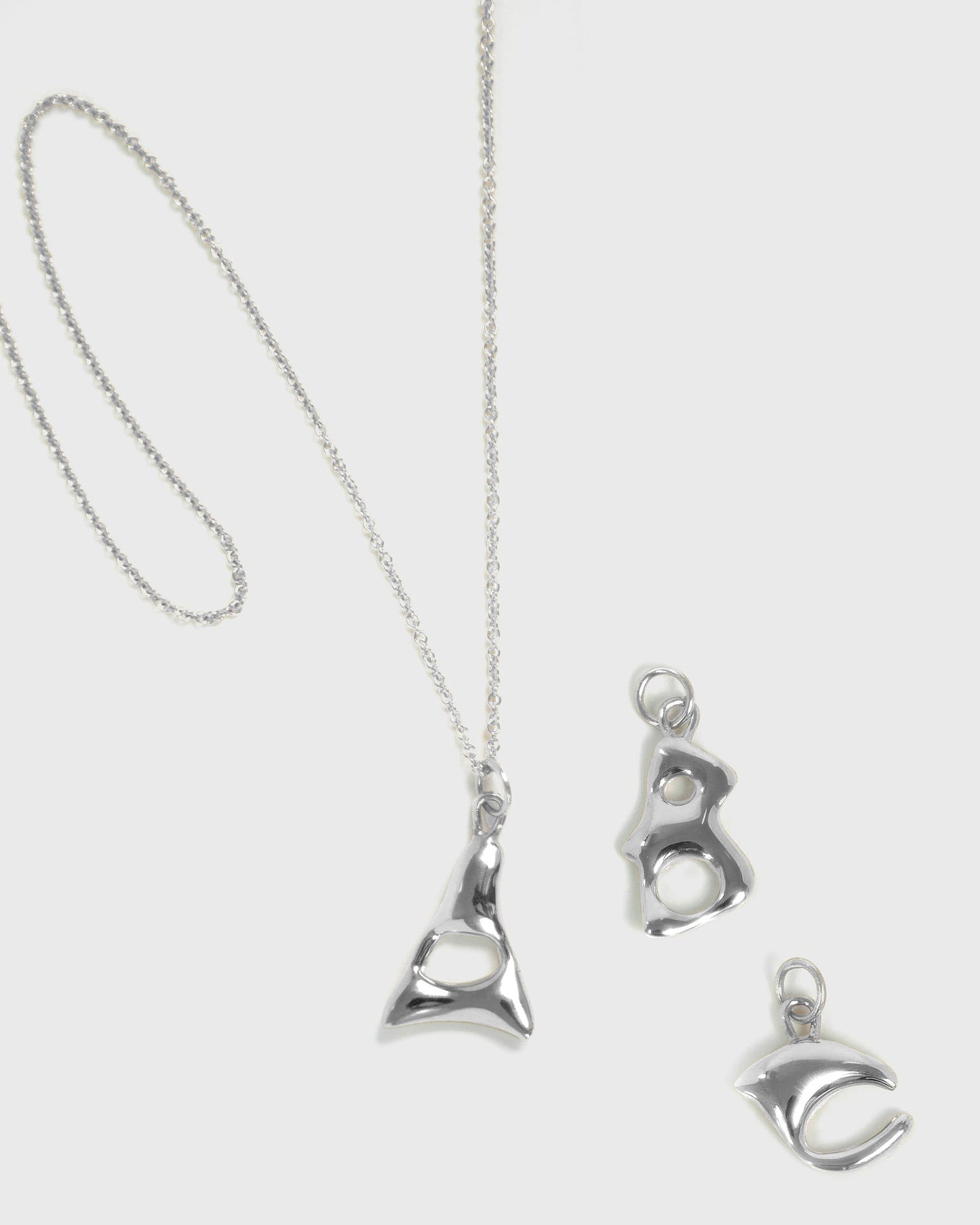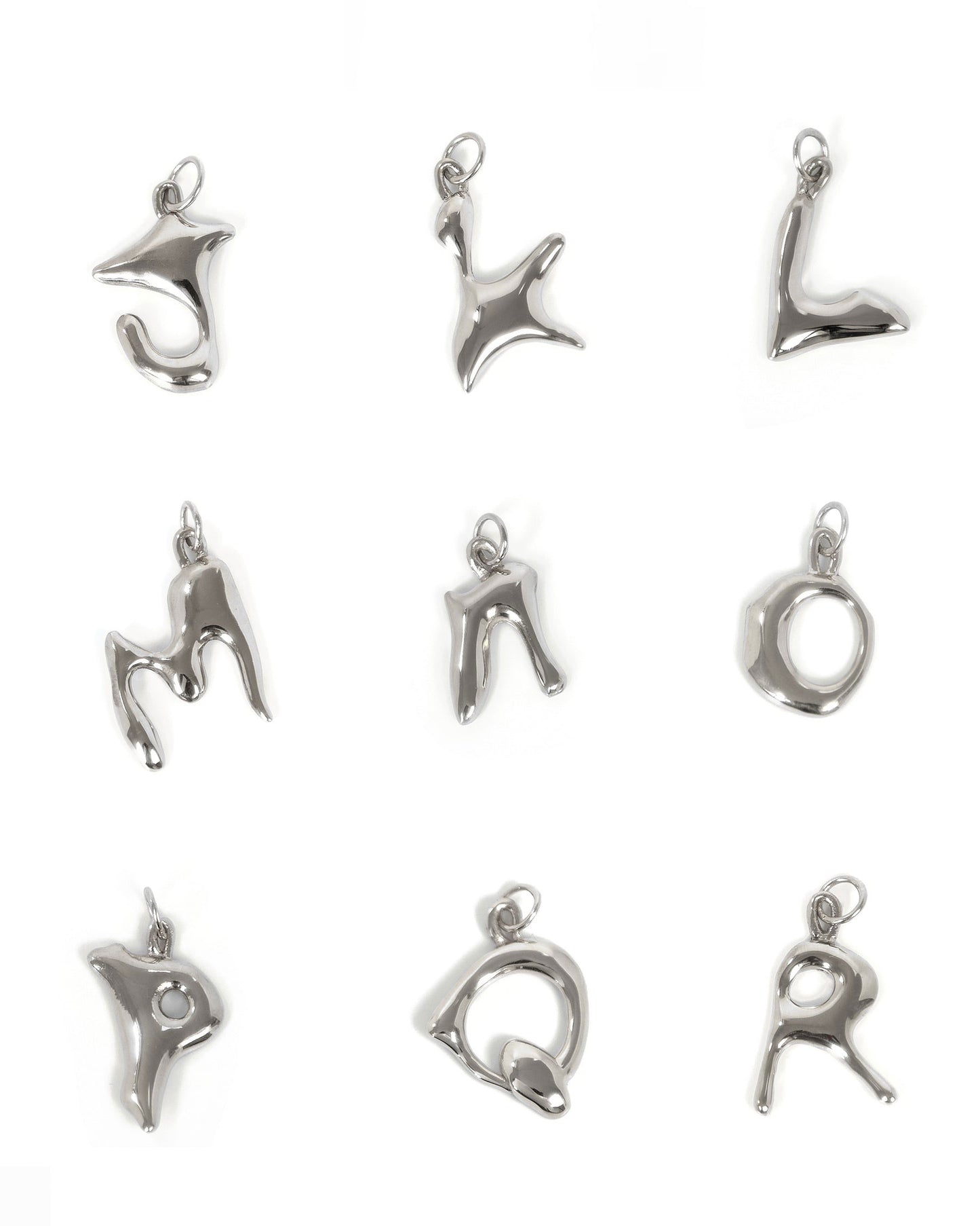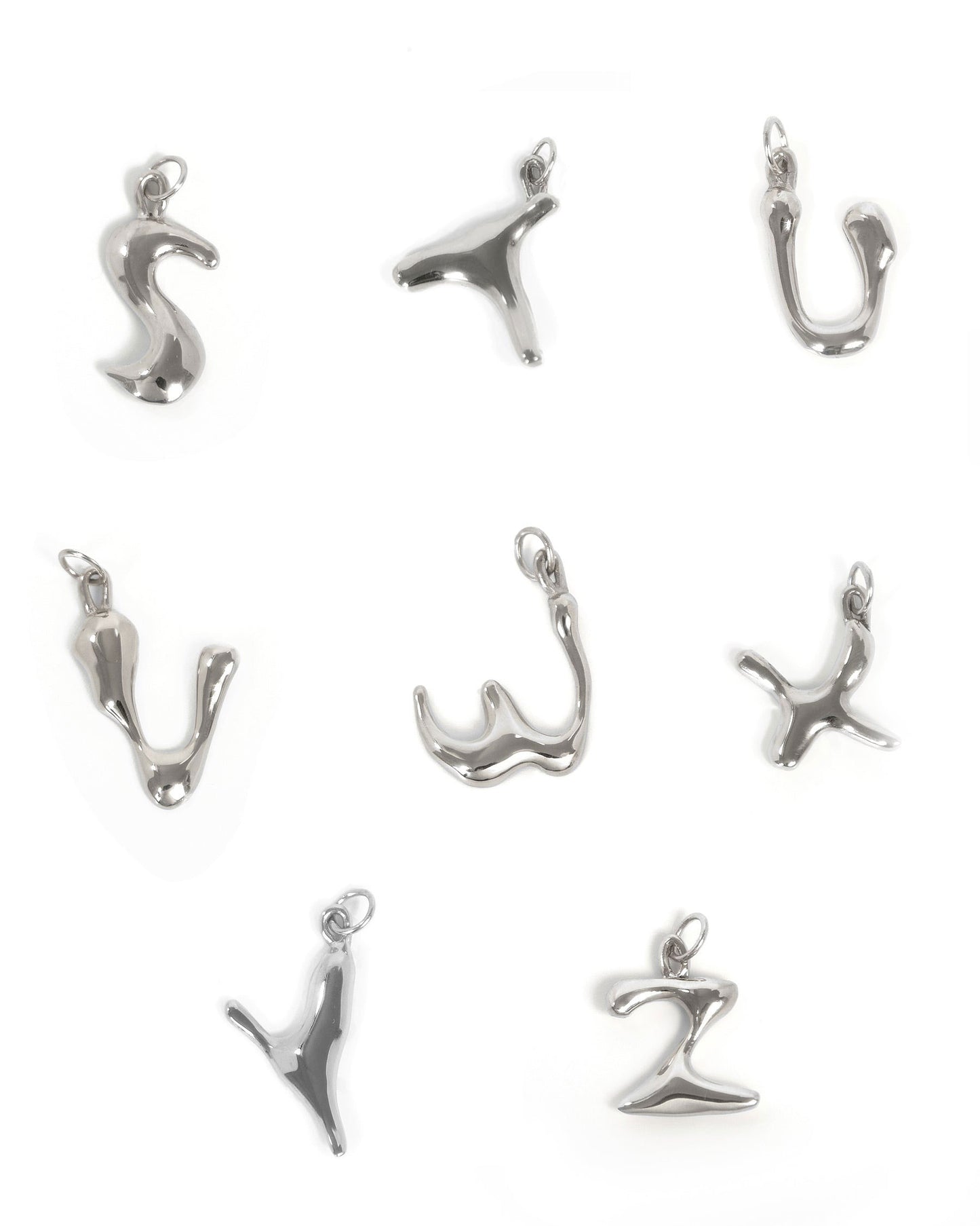 ALPHABET CHARM は、溶かしたワックスで一文字ずつ手描きするように形づくられたデザイン。